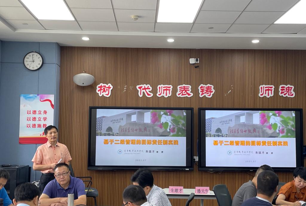 行政管理组由金华职业技术学院工会主席朱雄才教授授课,朱教授围绕“高职院校目标责任制考核管理运行机制”,结合金职院实践经验,详细介绍了如何根据学校规划目标来制定、运用、组织实施目标责任考核机制,如何依据目标导向要求进行工作任务的聚焦、分解、落实与监督,进而提高学校内部治理工作水平,推动学校各项工作高质量开展。