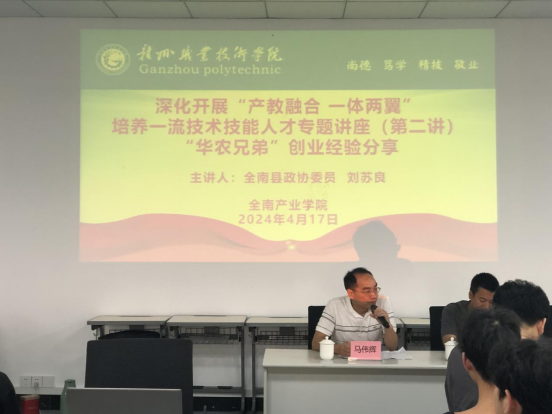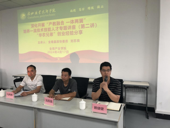 为激发学生的创新创业热情,培养适应社会发展需求的高素质技术技能型人才,4月17日下午,全南产业学院开展深化“产教融合一体两翼”培养一流技术技能人才专题讲座(第二讲)——“华农兄弟”创业经验分享,讲座邀请了全南县政协委员、创业达人、粉丝量1500多万“华农兄弟”博主刘苏良和全南县政协教科卫体和文化文史学习委员会主任马伟辉,会议由全南产业学院综合办公室负责人赖健健主持,全南产业学院全体师生共同参与。